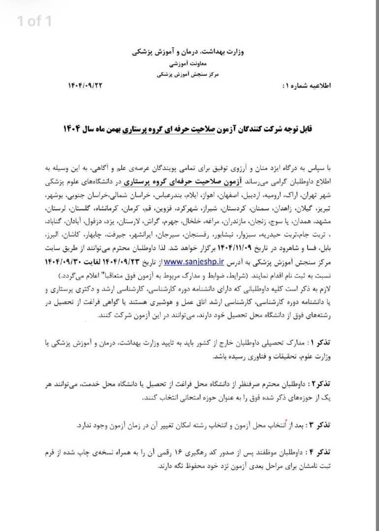 اطلاعیه شماره (۱) تاریخ: ۱۴۰۴/۰۹/۲۲ قابل توجه داوطلبان آزمون صلاحیت حرفهای گروه پرستاری